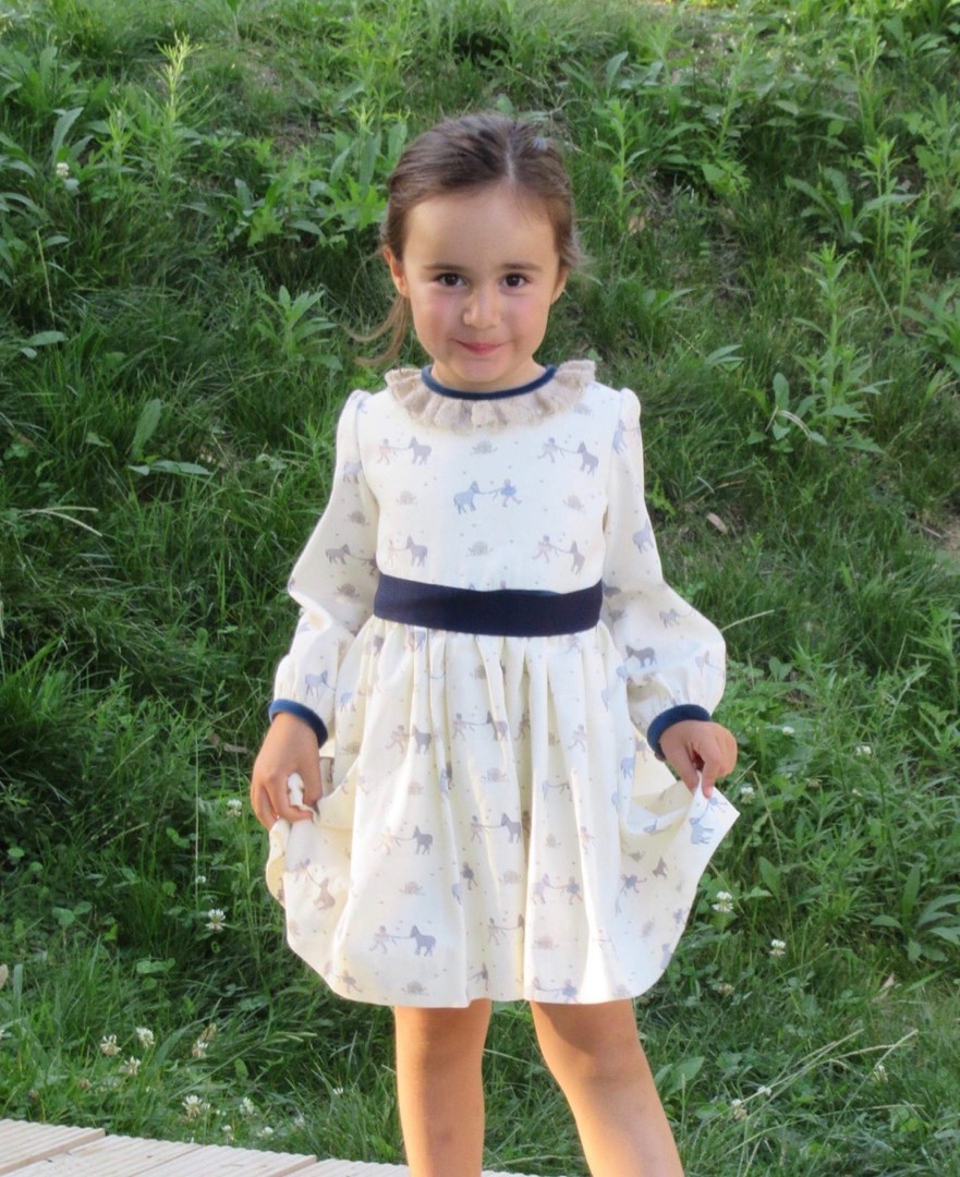 Vestido de manga comprida, com vivo em veludo nos punhos. Gola em renda de lã e fita de grogorão na cintura 100% Algodão Made in Portugal